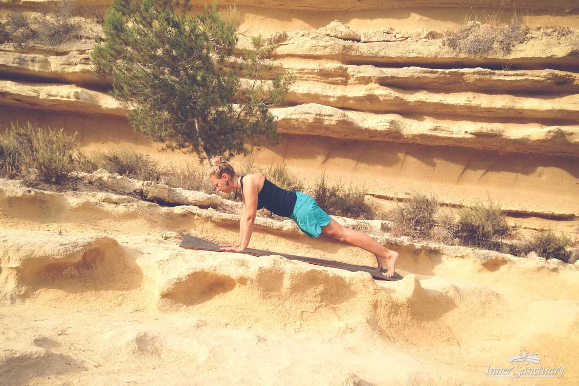 - With inhalation, tuck your toes under, press into your palms and lift your arms and entire body up.