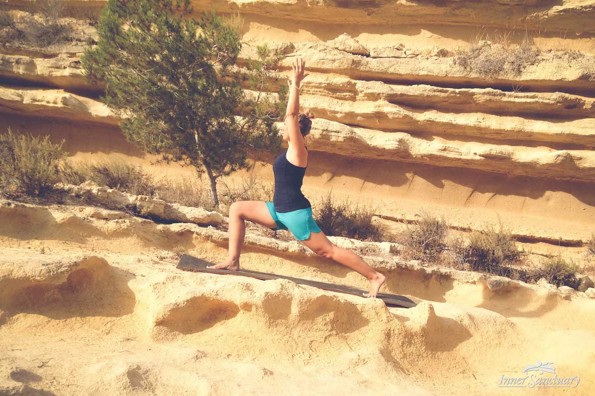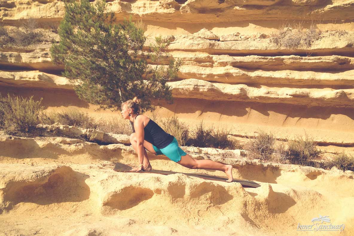 - Lift up your right leg slightly and bring it forward into a lunge. Stay here for a while, move around and feel your body consciously. Stay where it feels good, or if not gently rotate your hips, move forward and backward with your legs, connect with your centre.