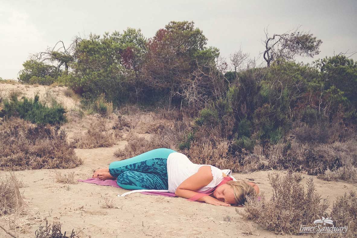 - Then turn to your left side, get into embryo pose by hugging your knees and send yourself some love.
