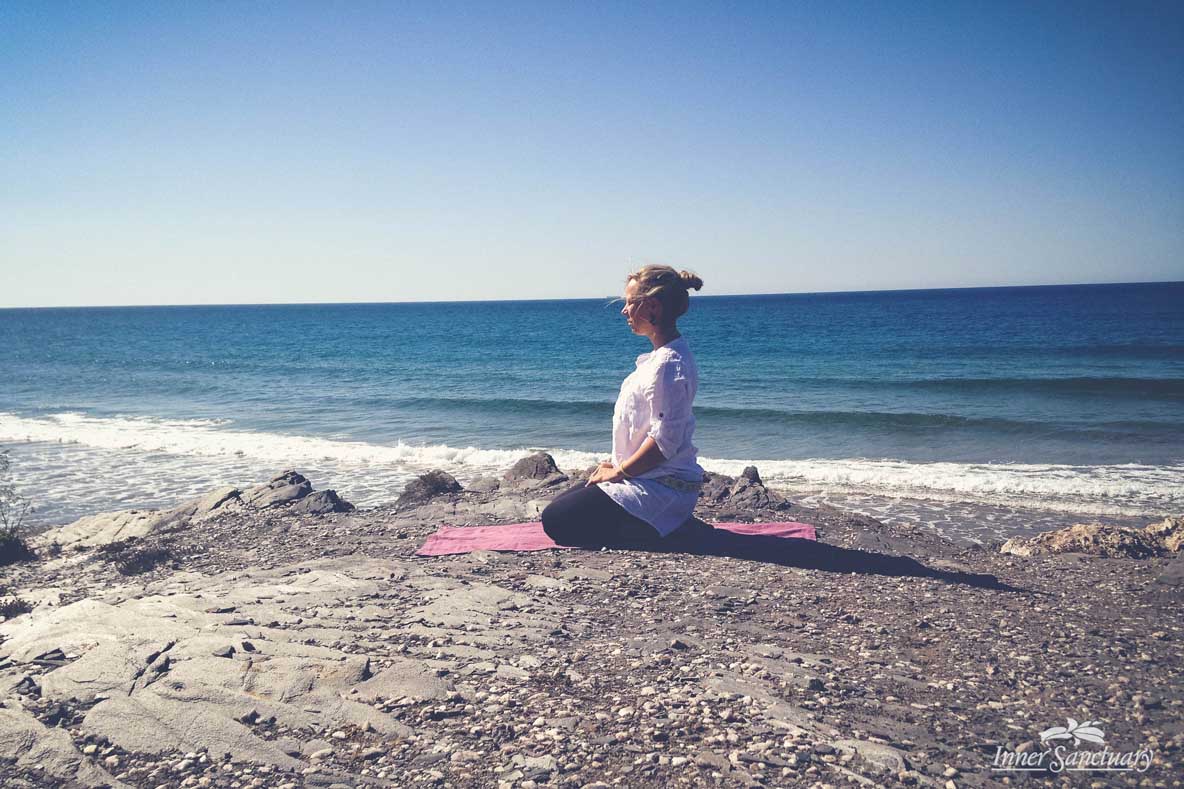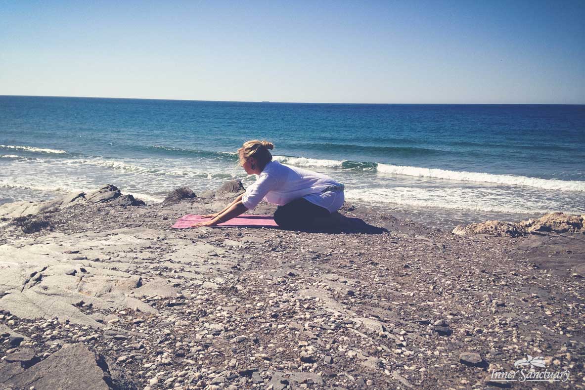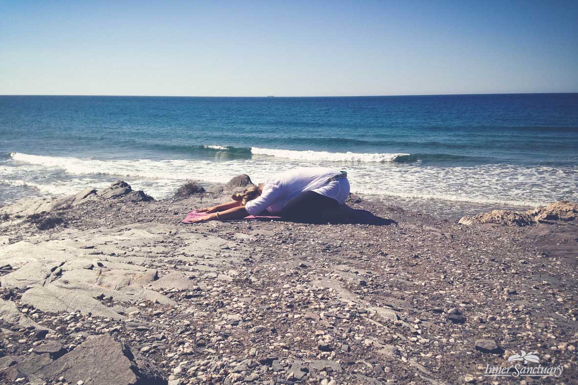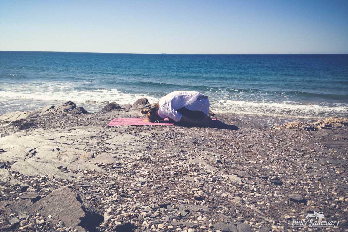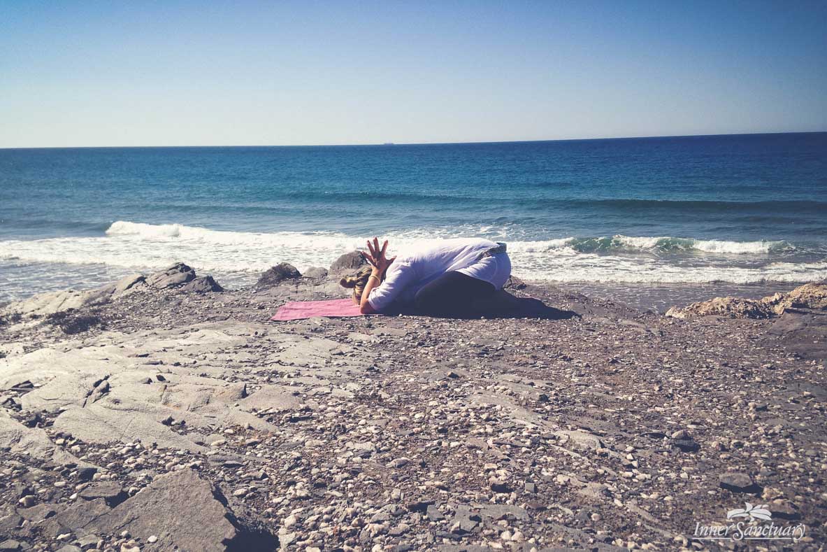 • Con la inhalación alarga la columna vertebral, transfiere energía amorosa y nutritiva entre los discos, relájate y con la exhalación entra más profundamente en la relajación, apóyate más abajo, bajando tu cuerpo y la cabeza hacia el suelo.