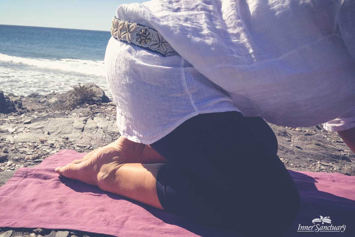 • Lleva las rodillas a los lados de tu alfombra, de modo que tus rodillas permanezcan ligeramente separadas.