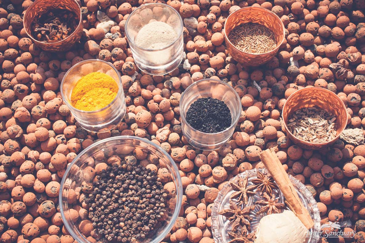 - Pomagajte svoji prebavi z vročimi ZAČIMBAMI: ingver, česen, črni poper, pekoča paprika, koriander, kumina, seme komarčka, muškatni orešček, kurkuma. Prav tako ne pozabite piti čim več suhega ingverja, cimeta in nageljnovih žbic, saj ogrejejo, izboljšajo cirkulacijo in pomagajo odpraviti sluz iz sistema. Izogibajte se prevelikim količinam začimb, ki stimulirajo in ogrejejo v primeru razjed ali neravnotežij Pitta doshe.