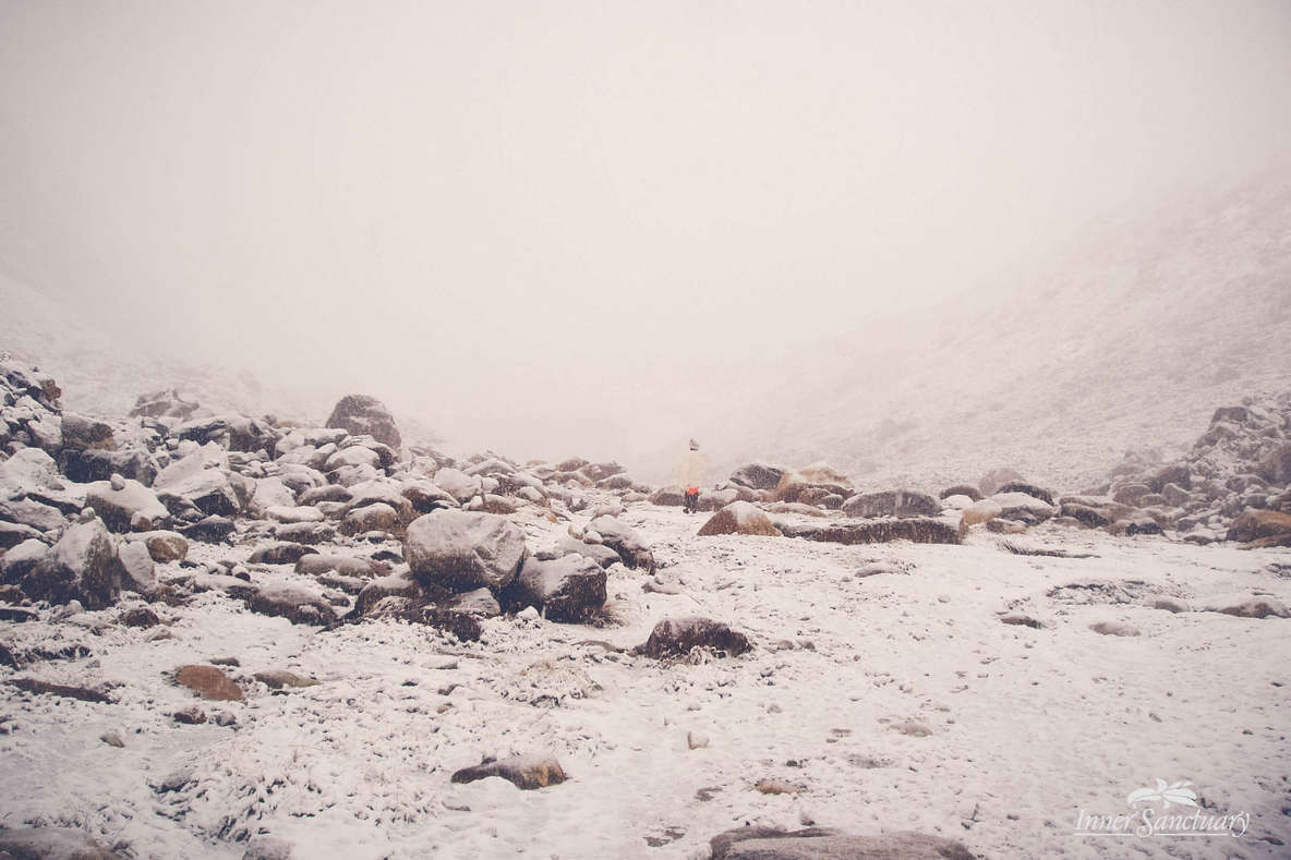 Ljudje, ki so naju srečali na poti, so naju opazovali z radovednostjo. Nekateri so gledali presenečeno, drugi so na obrazu imeli ironični izraz. Takoj, ko sva dosegla tabor na 3800 metrih, je začel padati prvi sneg. Glede na vremensko napoved sneg ni bil predviden vsaj še nekaj tednov. Bil je mesec junij. Pogledal me je z nasmehom: „Obožuješ sneg, ali ne? Mati narava pošilja darilo zate.“